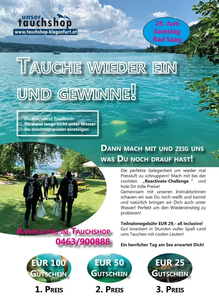 Sie sehnen sich wieder nach Ihrem Lieblingselement und Sie waren lange nicht tauchen? Dann ist das genau das Richtige für Sie! Das Team vom Tauchshop Klagenfurt lädt Sie am Sonntag, 29. Juni 2024 zu einem exklusiven Event ein, das speziell für Taucherinnen und Taucher konzipiert ist, die ihren Wiedereinstieg ins Wasser suchen.