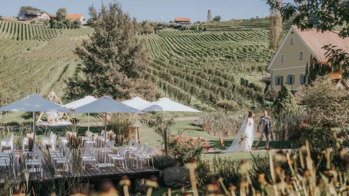 Romantik, Eleganz und Natur – das Weingut Georgiberg in der Südsteiermark bietet eine atemberaubende Kulisse für Ihre Traumhochzeit. Umgeben von sanften Weinbergen erstreckt sich das 5 ha große Anwesen mit stilvollen Terrassen, einem eleganten Restaurant und einem romantischen Steg an den hauseigenen Teichen – perfekt für eine unvergessliche Feier.