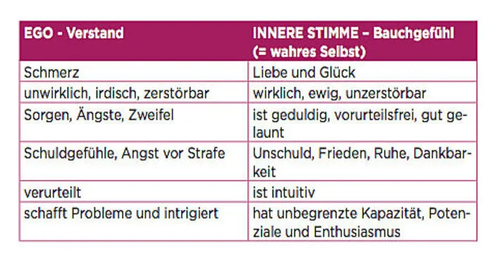 Natürlich ist es unrealistisch, zu erwarten, unserem Ego „den Mund zu verbieten“, Ängste und Unsicherheiten werden durch tagtägliche Ereignisse genährt. Schaffen wir es allerdings, die anerzogene Stimme des Egos zu erkennen und von der unserer Intuition zu unterscheiden, können wir zu unserem wahren Selbst gelangen.