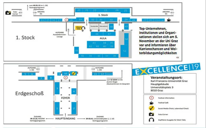Denn im Berufsleben wird mehr gefordert als reines Fachwissen. Und genau diese Persönlichkeits- entwicklung wird an der Uni Graz vorangetrieben: Bei der Job- und Karrieremesse „Excellence“ am 5. November 2019 haben Studierende und AbsolventInnen wieder die Möglichkeit, Kontakte zu zukünftigen ArbeitgeberInnen zu knüpfen.