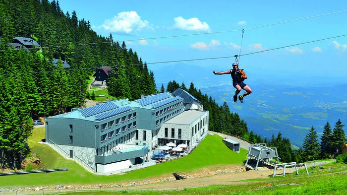 Vielfalt auf der Alm. Das Vier-Sterne-Hotel Golte liegt mitten im Hochkarstplateau und Landschaftspark Golte. Die atemberaubende Aussicht ist während Ihres Aufenthaltes genauso inklusive wie die Nutzung des modernen Wellnessbereichs und die herzliche Gastfreundschaft. Das Tüpfelchen auf dem „i“ sind die Gaumenfreuden, die hier auf 1400 Metern Seehöhe serviert werden. Wen nach einem erholsamen Tag zwischen Pool, Sonnenterrasse und Restaurant der Bewegungshunger packt, der ist genau am richtigen Ort. Ob eine Wanderung zum Bergsee, Mountainbiken über Stock und Stein oder eine rasante Fahrt mit der Zipline: In der wunderschönen Almlandschaft gibt es immer etwas zu entdecken.