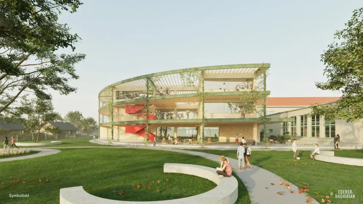 Der Um- und Neubau an der MS und Polytechnikum Dr. Renner in Liebenau erfolgt nach Plänen des Grazer Büros Ederer + Haghirian Architekten. Sie stellen dem denkmalgeschützten Bau einen halbkreisförmigen Neubau vor.