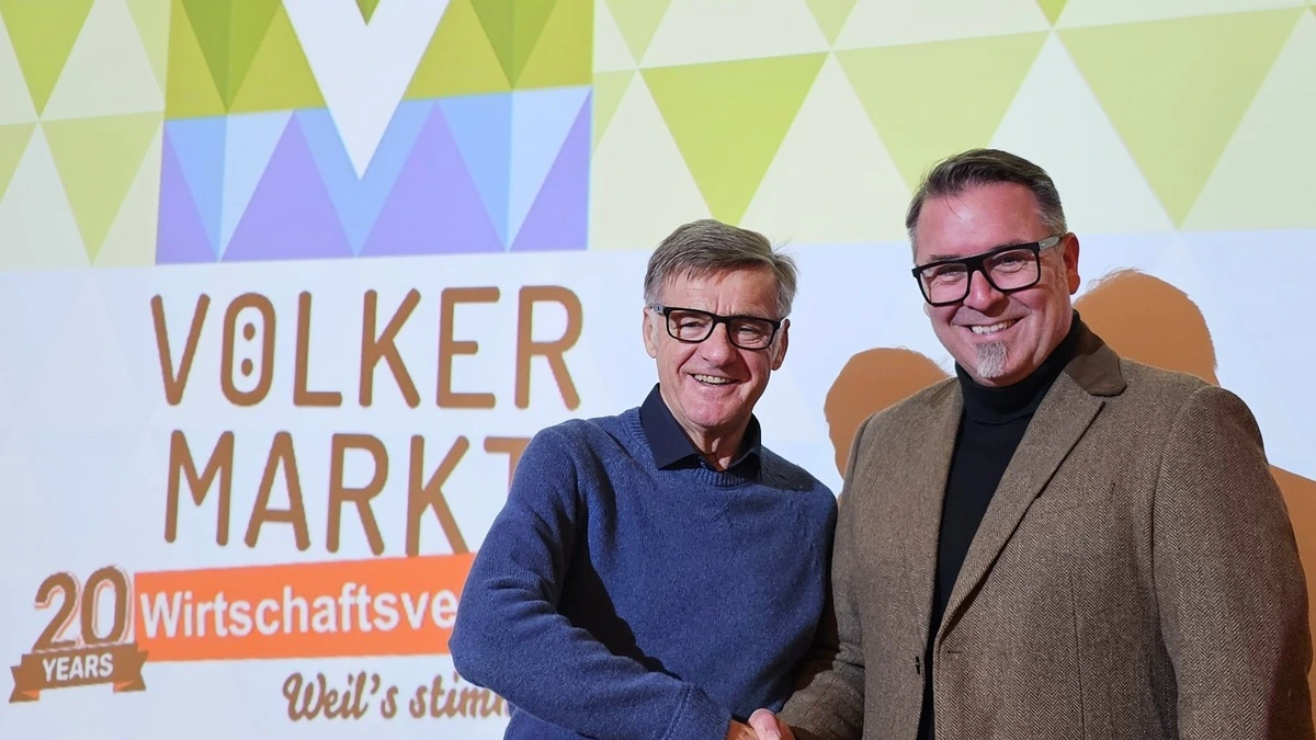 Wirtschaftsvereins-Obmann Karl Kräuter und sein Nachfolger Markus Liebhard stehen vor einem Logo des Wirtschaftsvereins und schütteln sich die Hände | Karl Kräuter und Markus Liebhard (von links)