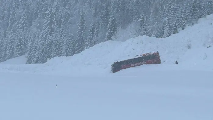 Großes Glück hatten zwölf Insassen eines Busses im Tiroler Bezirk Reutte gehabt. Gegen 5 Uhr ging eine Lawine auf die Lechtalstraße nieder, erfasste den Bus und schob ihn von der Straße ab