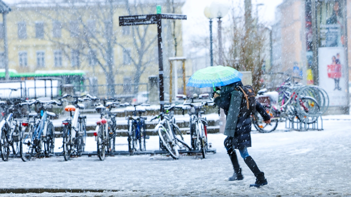 Schneechaos in Graz: Person schützt sich mit Schirm vor den Schneefällen