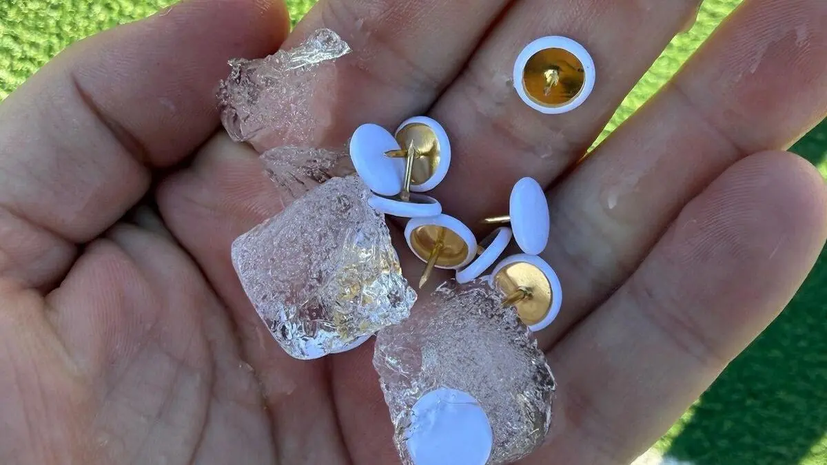 Diese mit Reißnägeln präparierten Eiswürfel fand Obmann René Petschnig am Samstag auf dem Fußballplatz