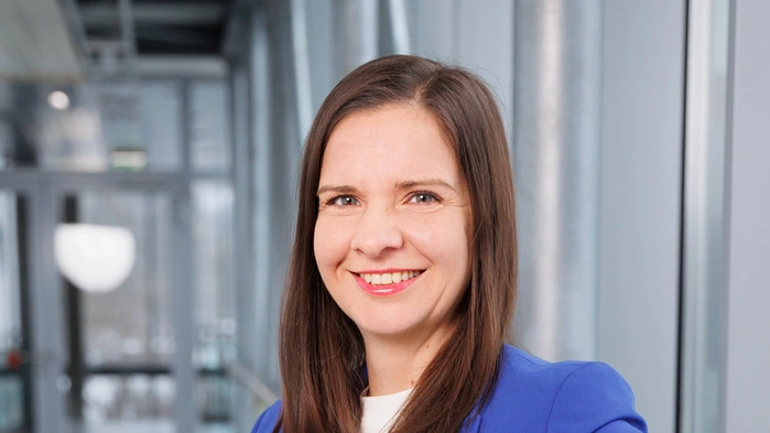 Man sieht eine Frau mit blauem Sakko in die Kamera lächeln