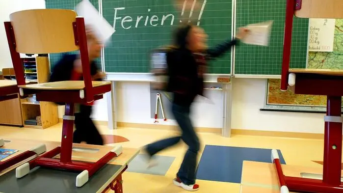 Zwei Kinder laufen aus dem Klassenzimmer, um in die Ferien zu starten