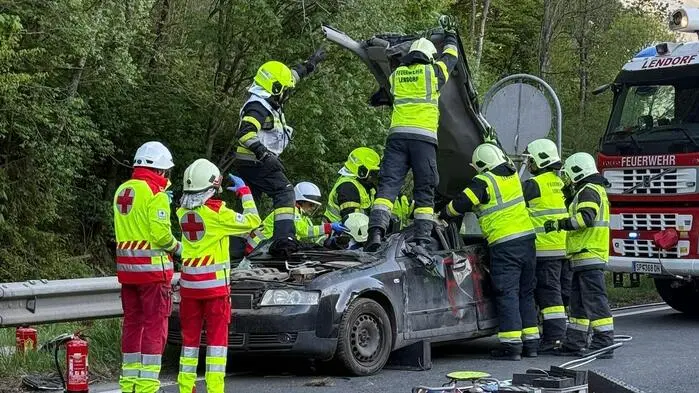 Mehrere Feuerwehren hantieren an einem verunfallten Auto herum
