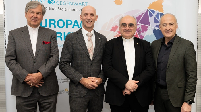 Herwig Hösele (Koordinator Pfingstdialog), Willibald Ehrenhöfer (Wissenschafts- und Wirtschaftslandesrat), Wilhelm Krautwaschl (Diözesanbischof Diözese Graz-Seckau), Heinz Mayer (Joanneum Research) stellten das Programm vor