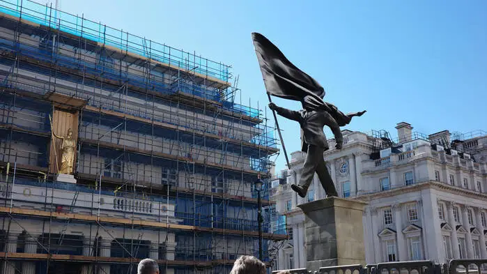 Passanten schauen sich die neue Statue im Zentrum von London an