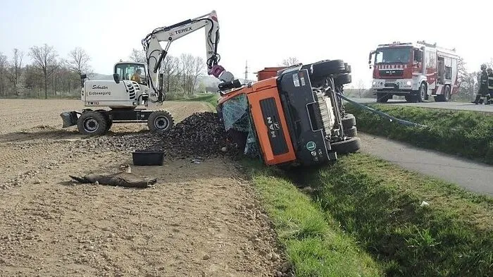 In Oberpurkla kippte ein Schotter-LKW um.