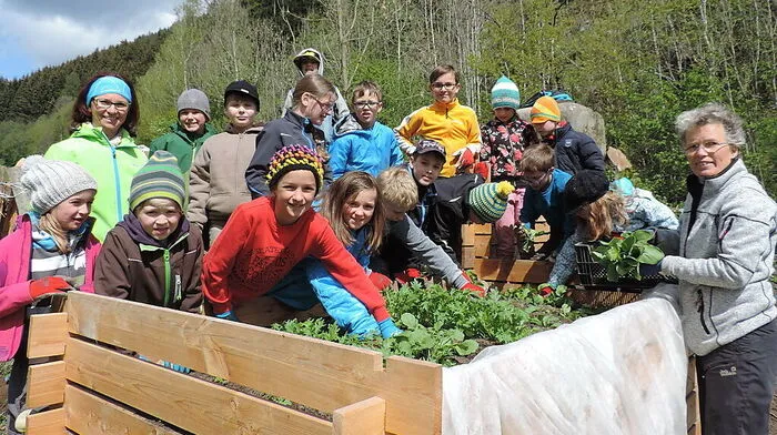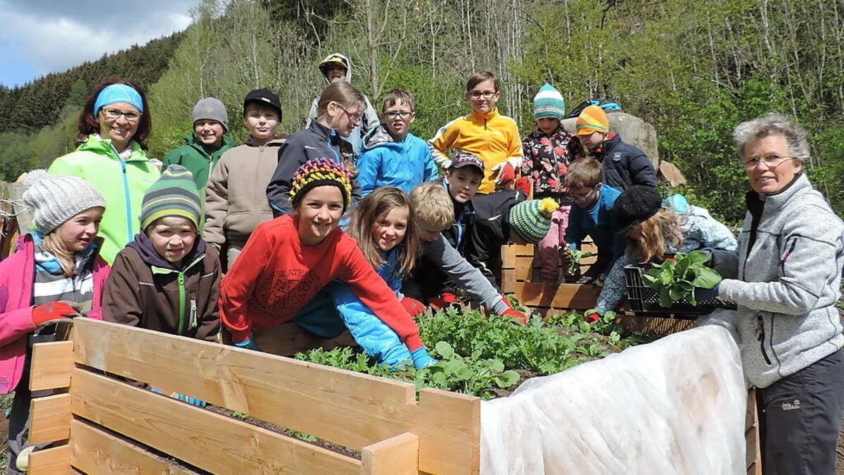 Mädchen und Buben der Volkssschule Kraubath zeigen mit Waldpädagogin Judith Nestler im Garten, dass sie einen grünen Daumen haben.Von Isabella Jeitler