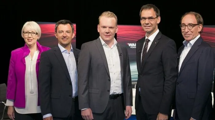 Die Vorarlberger Spitzenkandidaten: Neos-Landessprecherin Sabine Scheffknecht, SPÖ-Chef Martin Staudinger, FPÖ-Chef Christof Bitschi, Landeshauptmann Markus Wallner (ÖVP) und Grünen Chef Johannes Rauch