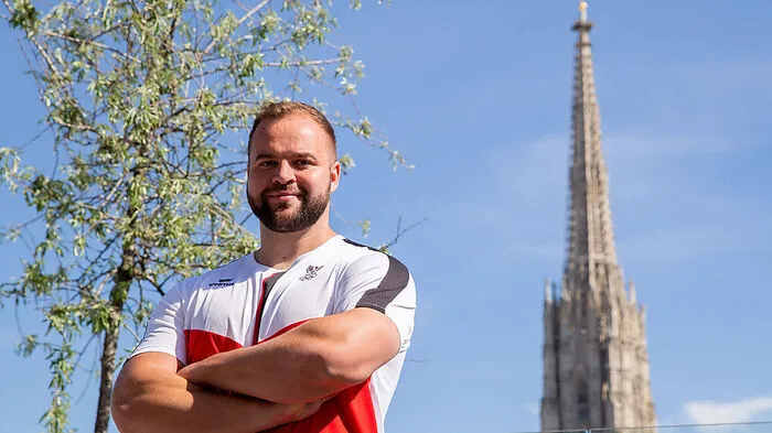 Diskuswerfer Lukas Weißhaidinger vor dem Stephansdom.