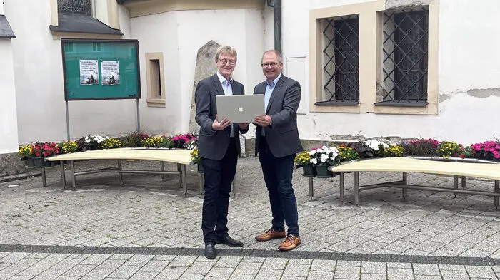 WestNet-Geschäftsführer Günter Rathswohl und Bürgermeister Bernd Osprian freuen sich über das kostenlose WLAN am Voitsberger Hauptplatz