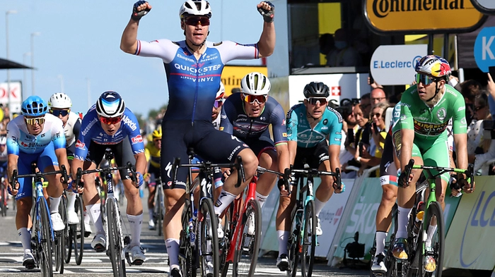 Der lästige Wind hat das Feld der Tour de France am zweiten Tag in Dänemark geärgert. Auftaktsieger Yves Lampaert verlor am Samstag nach hektischem Finale sein Gelbes Trikot. Der Belgier wurde Opfer eines von mehreren Stürzen, kam zwar wieder ins Feld zurück, wurde die Führung aber trotzdem los. Denn Wout van Aert fixierte im Massensprint als Zweiter hinter Fabio Jakobsen eine hauchdünn ausreichende Zeitbonifikation.