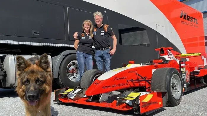 Sigrid und Christian Ferstl mit ihrem Hund "Lucky" und dem Rennauto