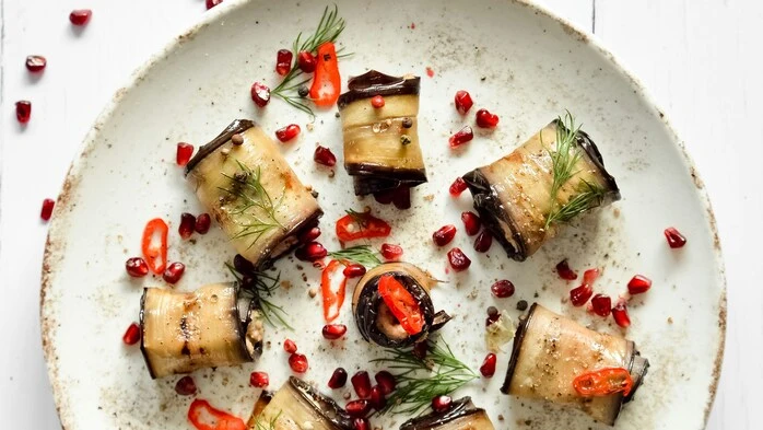 - Den entgräteten Fisch in zwölf kleine Stücke schneiden. Mit Basilikumcreme bestreichen. Je ein Fischstück auf eine Melanzanischeibe legen. Zu Rouladen aufrollen und mit Holzstäbchen verschließen. Auf die Paradeissauce setzen.