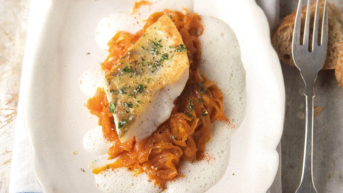 - Den Fisch auf dem Kraut anrichten. Restlichen Sauerrahm darüberträufeln.