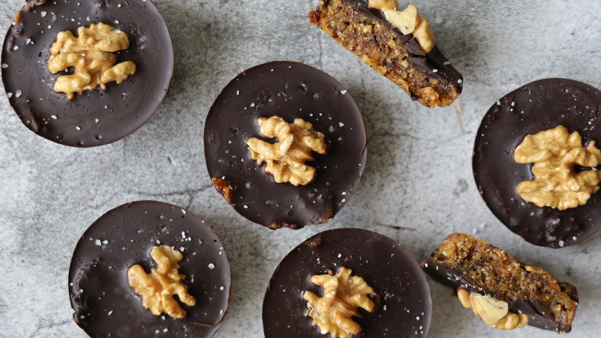 Die Walnüsse fein mahlen und die restlichen Zutaten hinzufügen. Gut vermengen bis eine leicht klebrige Konsistenz entsteht. In eine Muffin-Silikonform hineindrücken und kaltstellen. In der Zwischenzeit Schokolade mit Kokosöl schmelzen. Schokolade auf die gekühlte Masse in den Silikonformen verteilen. Mit Walnüssen toppen und noch einmal für mind. 30 Minuten im Gefrierfach kaltstellen. Fertig zum Genießen!