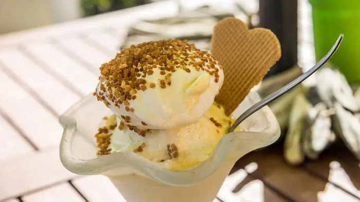 - Nun noch das Bratapfelmus mit den Rumrosinen unter die Creme ziehen. Eventuell mit einem Spritzer Zitronensaft abschmecken. In der Eismaschine gefrieren lassen. Karamellisierte oder in Punsch gedünstete Apfelspalten dazu servieren.