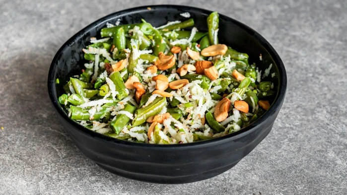 - Die Bohnschoten putzen, waschen und in kleine Stücke schneiden. In Salzwasser bissfest kochen. Abseihen und mit kaltem Wasser abschrecken.