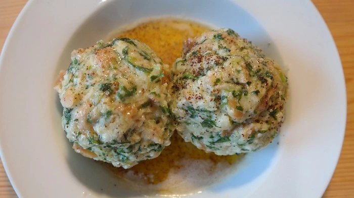 - Zwiebel fein hacken, in Butter andünsten und mit dem Knödelbrot vermischen.
