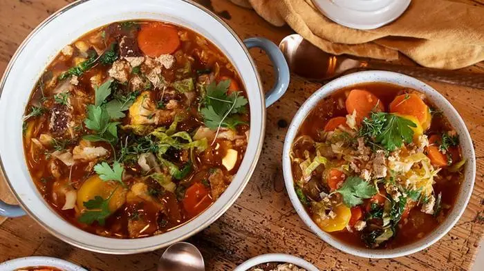 - Weißkraut hinzugeben, einige Minuten köcheln lassen. Das Lorbeerblatt entfernen und den Eintopf in Schüsseln anrichten. Den Tofu in einer Pfanne in zwei Esslöffeln Öl anbraten und im Eintopf servieren.