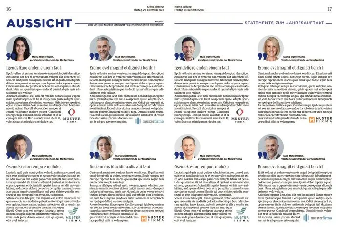 Revue passieren lassen und unseren Leser:innen einen Ausblick auf das Jahr 2024 bieten können. Sprechen Sie über aktuelle Themen, die die Branche bewegen. Präsentieren Sie sich als Marktführer und geben Sie spannende Einblicke in Ihre Vorhaben. Die Kleine Zeitung Leser:innen, wichtige Einflussnehmer:innen und Peers aus der Steiermark und Kärnten, erfahren somit von Ihrem Ausblick zur wirtschaftlichen Zukunft.