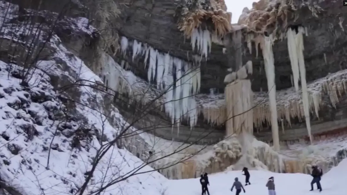Eine Gruppe Touristen entkommt nur knapp, als Teile des gefrorenen Valaste-Wasserfalls plötzlich abbrechen.