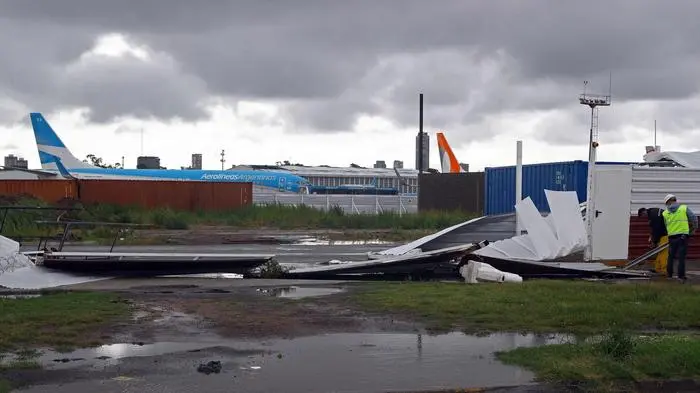 Am Jorge-Newbery-Flughafen richtete der Sturm ebenfalls massive Schäden an. Ein lokaler Journalist filmte dabei eine spektakuläre Szene: Eine Boeing 737 in Parkposition wurde von einer Windböe erfasst und rollte ohne Pilot im Cockpit plötzlich los – beinahe wie ein Spielzeug. Das Flugzeug drehte sich ein und rammte dabei unter anderem die Fluggastreppe. Es wurde schwer beschädigt. Insgesamt mussten aufgrund des Unwetters über 100 Flüge gestrichen werden.
