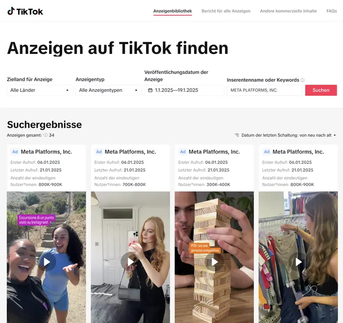 Zusätzlich schaltete Meta Anzeigen, die alle seine Plattformen – und insbesondere das Videoformat „Reels“ – als direkte Konkurrenten zu TikTok positionierten. Kurz bevor TikTok am Sonntag für etwa 14 Stunden seinen Betrieb einstellte, berichteten einige Nutzer, dass zu den letzten Dingen, die sie auf der Plattform sahen, gesponserte Beiträge für Instagram gehörten. „Es überrascht nicht, dass Meta, während TikTok heute Abend herunterfährt, meine FYP mit Werbung für Instagram überflutet“, schrieb eine Person in einem Bluesky-Post und bezog sich dabei auf TikToks KI-gesteuerten For You Page-Feed. Die TikTok-Anzeigenbibliothek, ein Transparenz-Tool, mit dem jeder nachsehen kann, welche bezahlten Kampagnen auf der Plattform laufen, zeigt, dass Meta um Jänner Dutzende von gesponserten Videos über Instagram und Reels schaltete, die insgesamt von Millionen von Nutzern angesehen wurden.