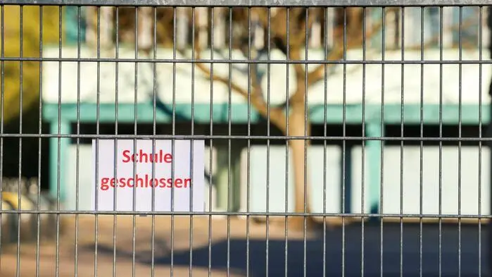 „Schule geschlossen“ steht am verschlossenen Tor der „Sekundarschule Am Biegerpark“ in Duisburg-Huckingen