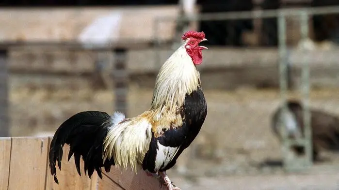 Ein Hahn steht auf einer Holzwand | Das Hausgeflügel des erkrankten US-Amerikaners dürfte Kontakt zu Wildvögeln gehabt haben (Symbolfoto)