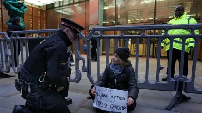 Ein Sprecher der City of London, die der historische Kernbezirk der Metropole ist, teilte mit, eine 22-jährige Frau sei festgenommen worden, weil sie ein Plakat zur Unterstützung einer verbotenen Organisation gezeigt und damit gegen das britische Anti-Terrorismusgesetz verstoßen habe.