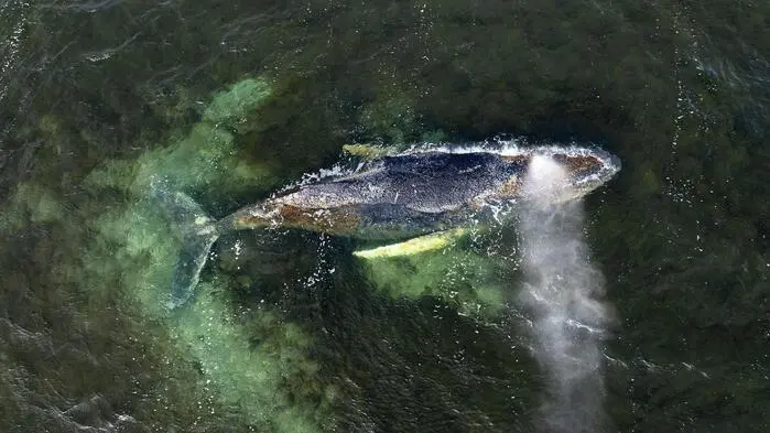 Eine Drohnenaufnahme zeigt den Buckelwal in der Wismarbucht. Der Gesundheitszustand des Tieres gibt Anlass zur Sorge