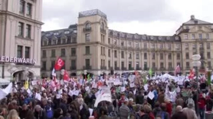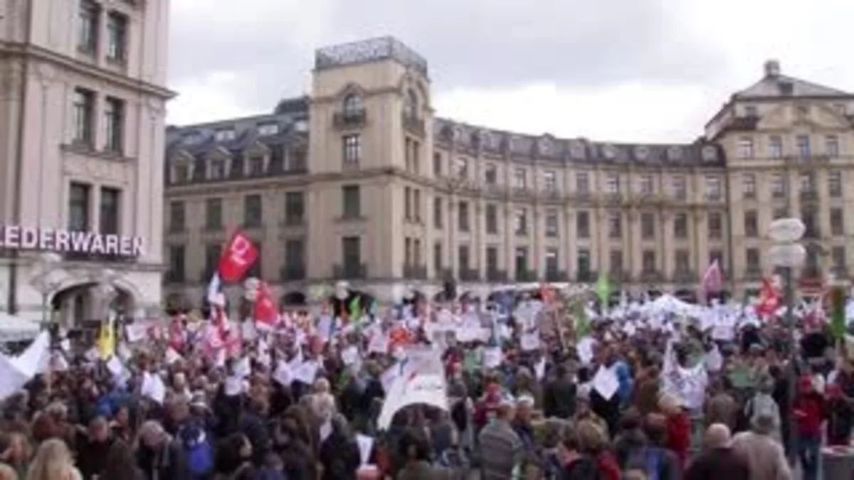 In München sind nach Teilnehmerangaben weit mehr als 10.000 Menschen auf die Straße gegangen, um gegen das Feihandelsabkommen zwischen der EU und den USA zu demonstrieren.