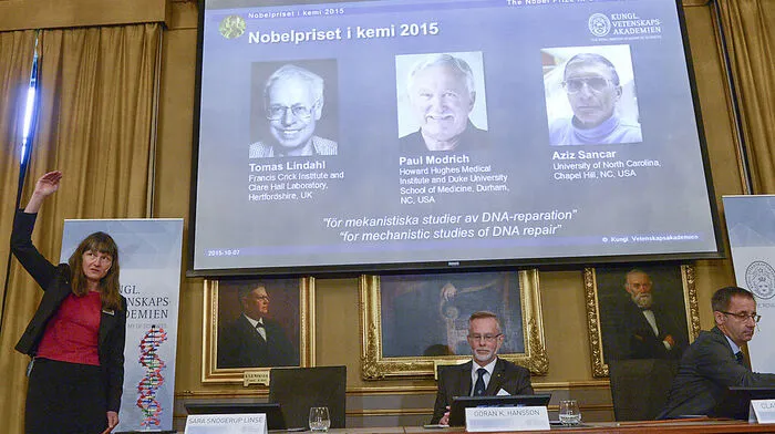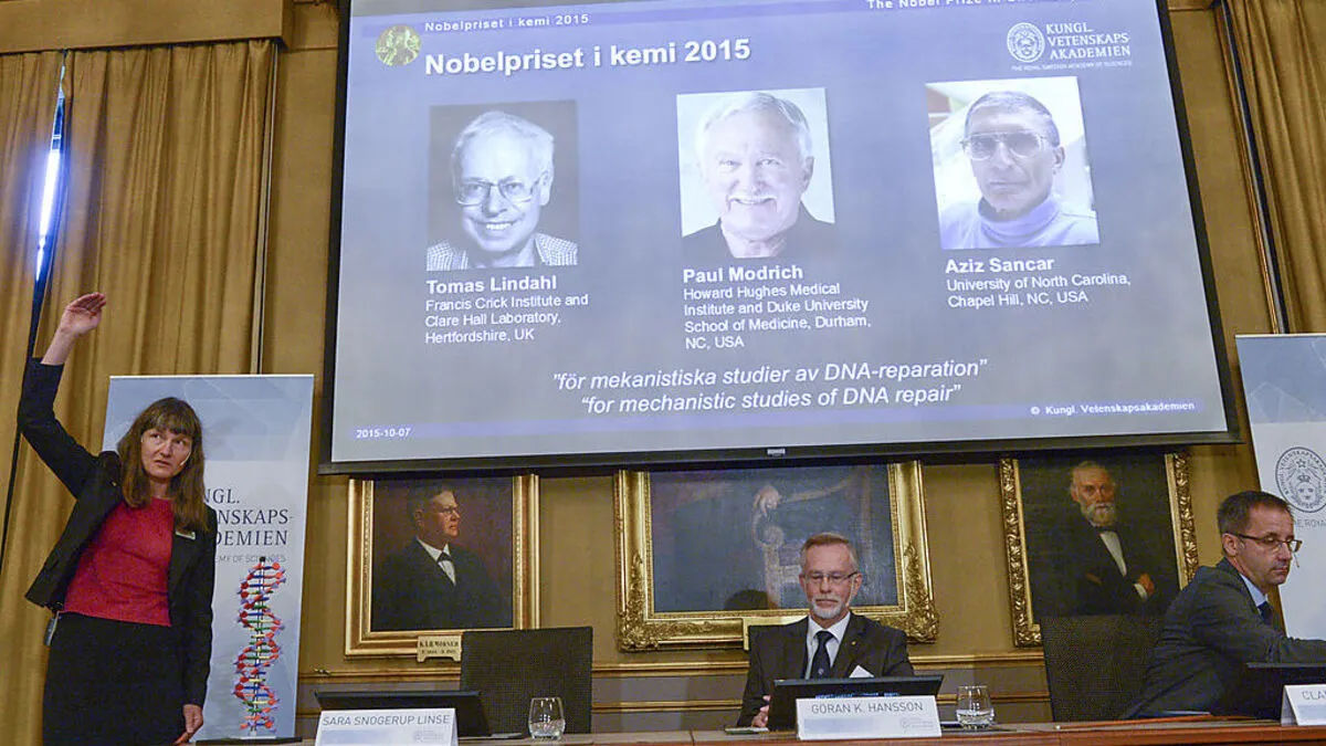 Der diesjährige Nobelpreis für Chemie geht an die zwei in den USA tätigen Biochemiker Paul Modrich und Aziz Sancar sowie den in Großbritannien arbeitenden Schweden Tomas Lindahl.