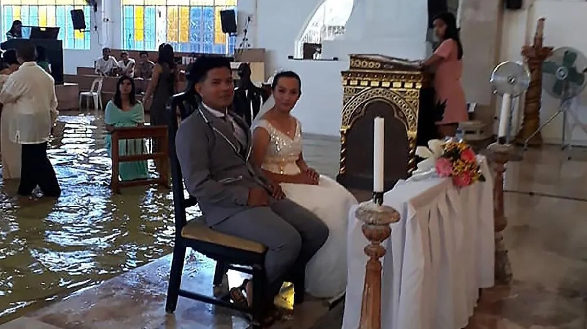 Mit Boot zur Hochzeit: Braut watet durch überflutete Kirche zum Altar
