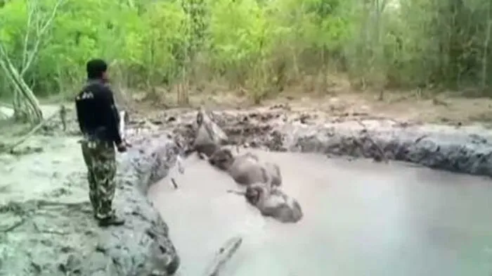 Mehrere Baby-Elefanten steckten in Thailand hilflos in einem Schlammloch fest.