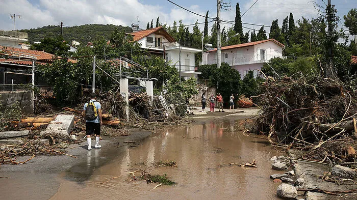 Häuser und Straßen stehen nach Starkregen auf Euböa unter Wasser. Hunderte Menschen, darunter viele Urlauber aus Athen, konnten sich auf ihre Hausdächer retten. Unter den Toten ist auch ein wenige Monate altes Baby.