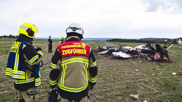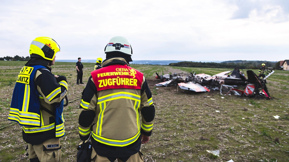 Zwei Kunstflieger sind mit ihren jeweiligen Maschinen in der Nähe des Flugplatzes Leumnitz in der Luft zusammengeprallt - beide Piloten verstarben. Weitere Tote oder Verletzte hat es nicht gegeben.