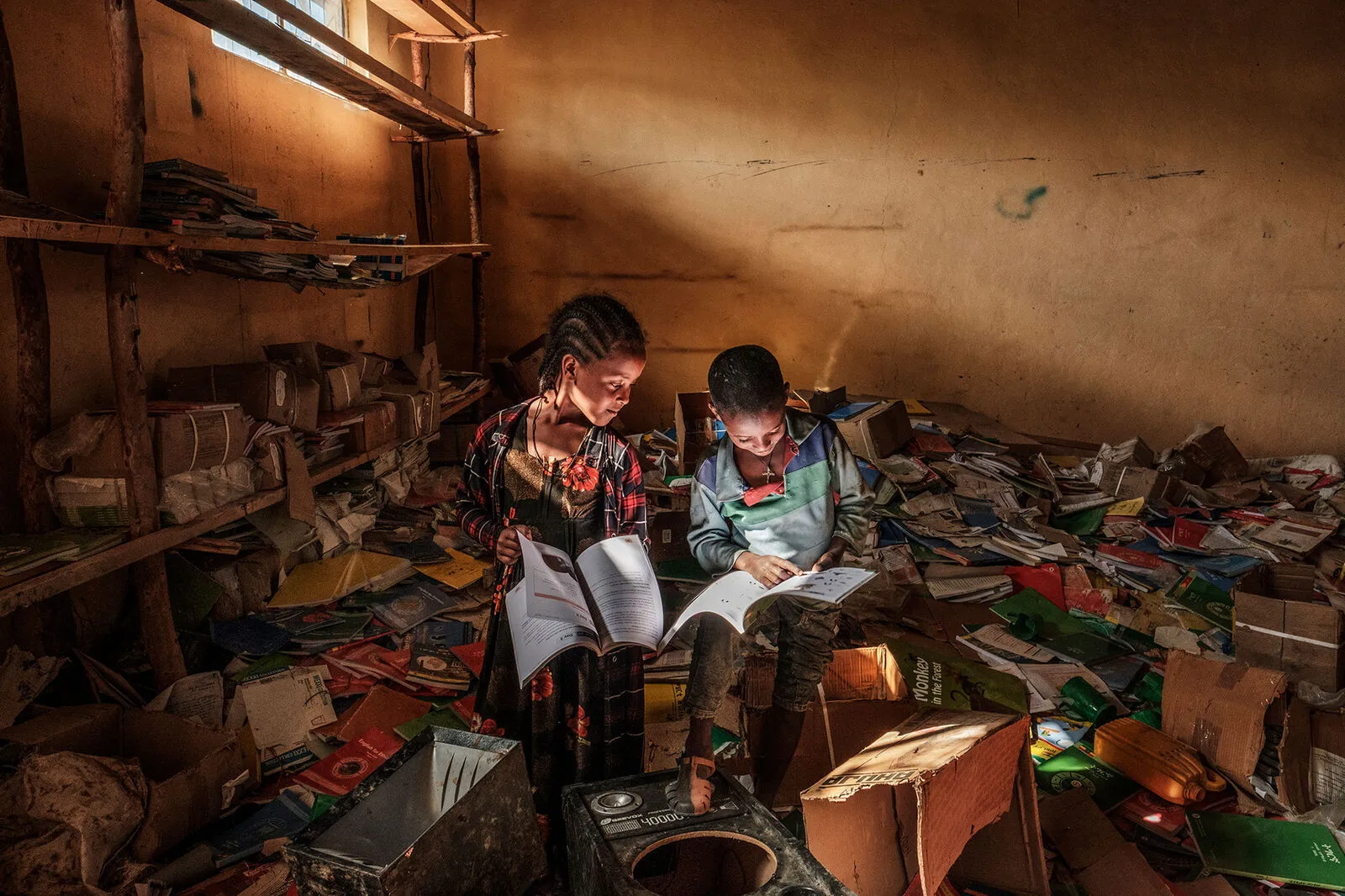 Bild des Fotografen Eduardo Soteras zeigt zwei Kinder, die in der kriegsverwüsteten Bibliothek einer Volksschule in der äthiopischen Region Tigray in Bücher vertieft sind und lächeln.
