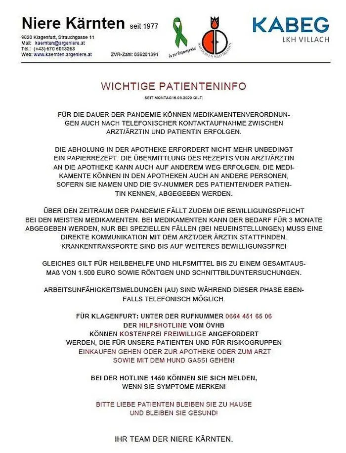 In einer Aussendung von "Niere Kärnten" heißt es: "Bei Medikamenten kann der Bedarf für 3 Monate abgegeben werden. Nur bei speziellen Fällen (bei Neueinstellungen) muss eine direkte Kommunikation mit dem Arzt/der Ärztin stattfinden."
