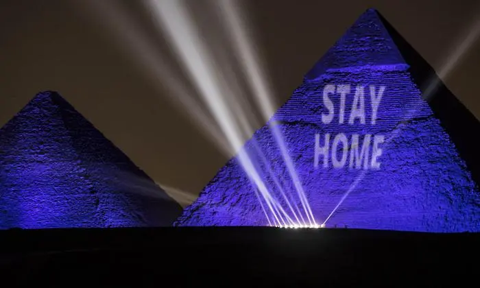 Auch die großen Pyramiden in Ägypten erinnern dieser Tage an die herrschende Ausnahmesituation während der Corona-Krise. Die Botschaft ist klar: Zuhause bleiben!