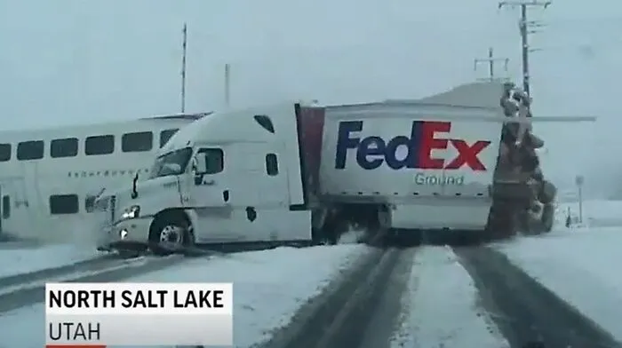 Glück im Unglück hatte der Fahrer eines FedEx-Lkws im US-Bundesstaat Utah. Sein Fahrzeug wurde von einem Zug erfasst, doch der Lenker blieb nahezu unverletzt.