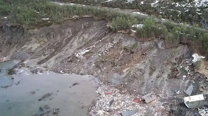 Wenige Tage nach einem Hunderte Meter breiten Erdrutsch ist es im Norden Norwegens erneut zu einem größeren Abgang gekommen. Während beim ersten Vorfall am Mittwoch mehrere Häuser und Hütten ins Meer gespült worden waren, klaffte nun im selben Gebiet in der Kommune Alta ein gewaltiges Loch in einer Uferregion.