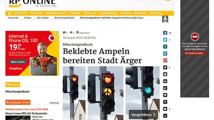 Rotes Herz, gelbes Peace-Zeichen, grünes Hanfblatt - was Autofahrer lächeln lässt, macht Stadtmitarbeiter laut einem Bericht der Rheinischen Post wütend. Sie müssen die Ampelaufkleber nämlich entfernen - eine teure Sache.