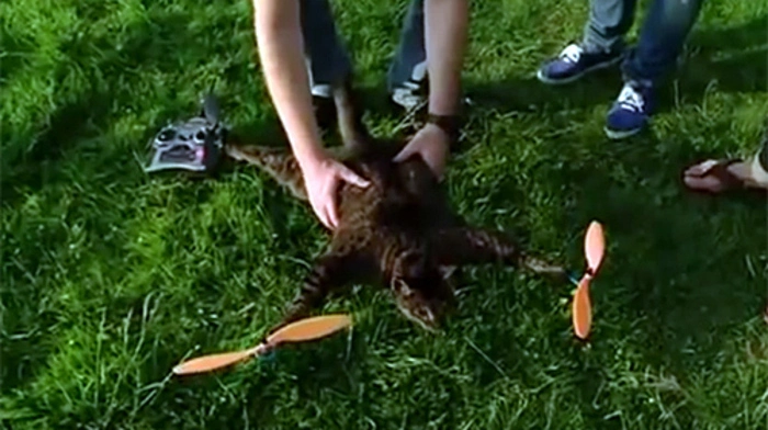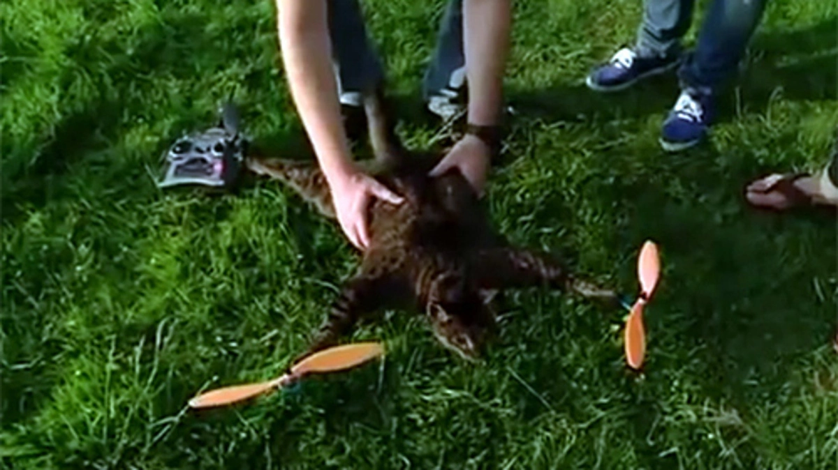 Zwei niederländische Künstler lassen tote Tiere fliegen: Bart Jansen und Arjen Beltman montieren Tierpräparate an Drohnen. Jetzt ließen sie auf dem Gelände des Naturhistorischen Museums in Bern eine Katze abheben.